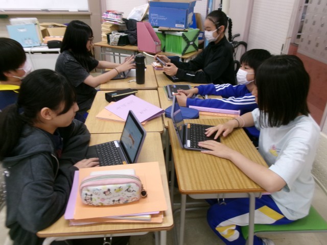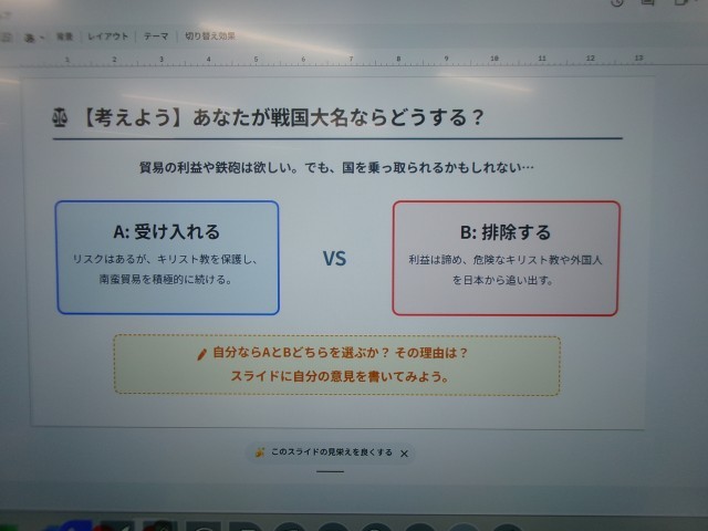 今日は、自分が戦国大名だったら、「リスクはあるが、キリスト教を保護して南蛮貿易を積極的に受け入れる。」か「利益は諦め、危険なキリスト教や外国人を日本から追い出す。」かを選択して行う、ディベートの準備をしていました。