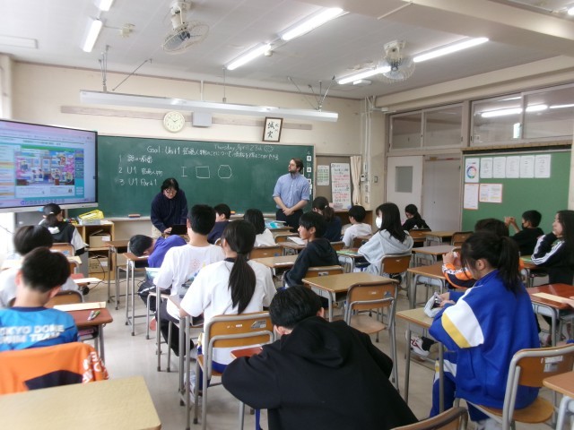 7年生英語の授業 公開日 2026/04/23 更新日 2026/04/23 7年生 4月23日、7年生英語の授業の様子です。今日は、単語を組み合わせて英文をつくる練習をしていました。ALTも〇付けをしてくれました。このALTは今年からの先生ですが、好青年といった感じの先生です。