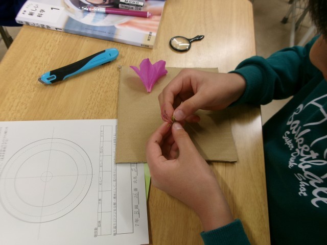 上手にめしべやおしべを外して、カッターで半分に切るなど上手におこなっていました。