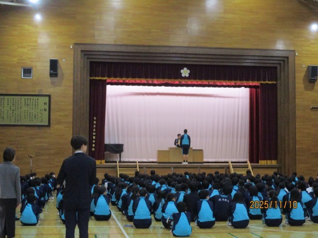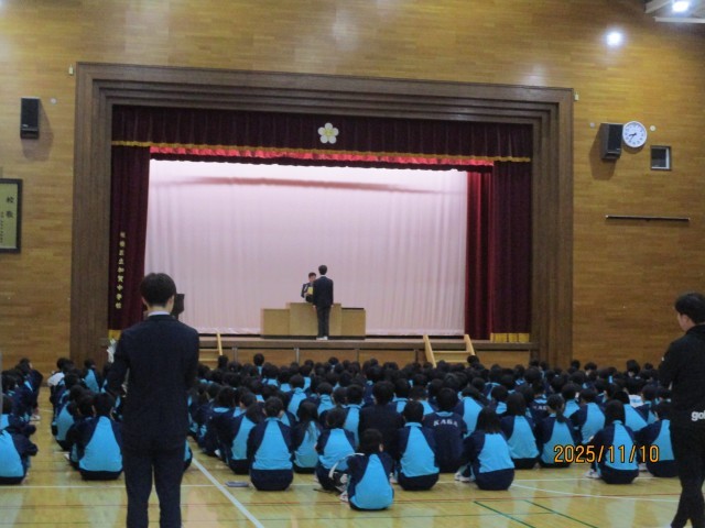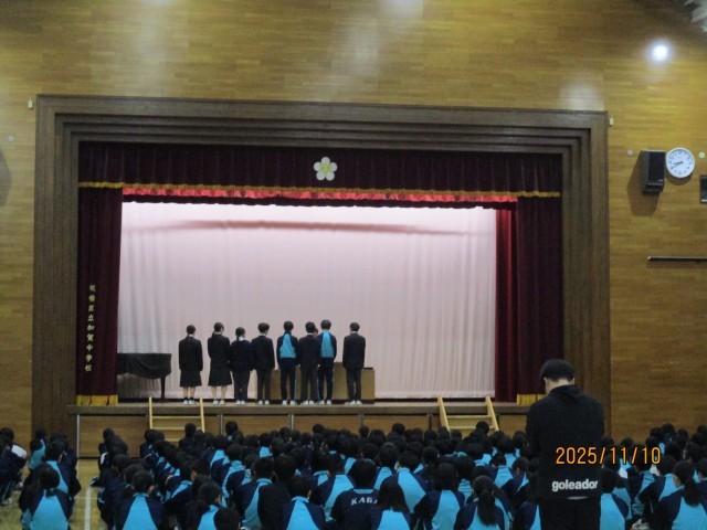 本日9日は、朝礼が実施されました。最初に校長先生からお話がありました。『君の存在を意識する』という本の紹介から始まり、12月4日から10日までの人権週間に関連させて、他人はもちろん自分の人権も意識し、守っていくことの大切さを訴えるお話は生徒の胸に残ったことと思います。言った人は軽い気持ちでも、言われた人は傷つくことがあることを認識し、加賀中学校から人を苦しめるような言動をなくしていこうと生徒は誓っていました。続いて生徒表彰に移り、初めに、白梅祭でのビブリオバトルで『二人一組になってください』を紹介し、最も得票を集めた生徒の表彰がありました。続いて、柔道大会の個人戦で活躍した生徒、板橋区の卓球大会で活躍した男子団体チーム、個人戦で活躍した生徒の表彰がありました。全校生徒は、それぞれの生徒の栄誉を大きな拍手で讃えていました。最後に、生活指導主任から、感染症予防、交通安全、ふれあいアンケートの3件についてお話がありました。いずれも大事な内容で、生徒も真剣に聞き入っていました。期末考査まであと2日。インフルエンザが流行っていますので、体調には十分に気を付けて、試験勉強に頑張ってほしいと思います