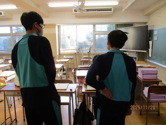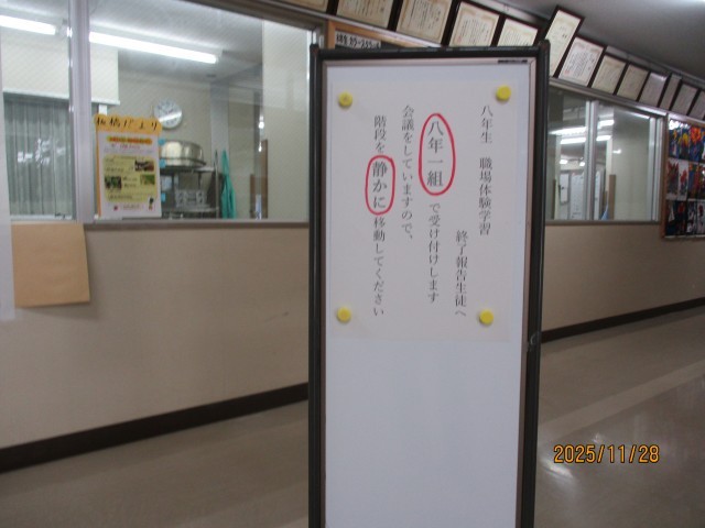 本日28日は、8年生の職場体験の最終日でした。25日から28日までの4日間のうちの3日間を職場で仕事を体験させていただきました。それぞれ職場体験の最終日の3日目のみ、職場での仕事が終了した後、学校に来て「体験終了の報告」をしました。本日は最終日でしたので、多くの生徒が報告に来ましたが、どの生徒も、職場体験を終えて、充実した顔で報告をしているのが印象的でした。学校から離れて実際に仕事をするという貴重な体験の中から、社会で働くことの意味などについていろいろと学ぶことができたと思います。仕事の大変さ、協力することの大切さ、責任の重さなどとともに、働くことの楽しさも感じ取ったのではないかと思います。また、社会人として職場での礼儀やマナーの大事さも実感できたのではないかと思います。来週の12月6日土曜日の授業公開では、1校時から3校時まで各教室で「職場体験事後学習発表」として各自の体験について発表します。どのような経験を積むことができたのか発表が楽しみです。お忙しい中、生徒を受け入れてご指導をいただいた多くの職場の皆様には心よりお礼を申し上げます。本当にありがとうございました。