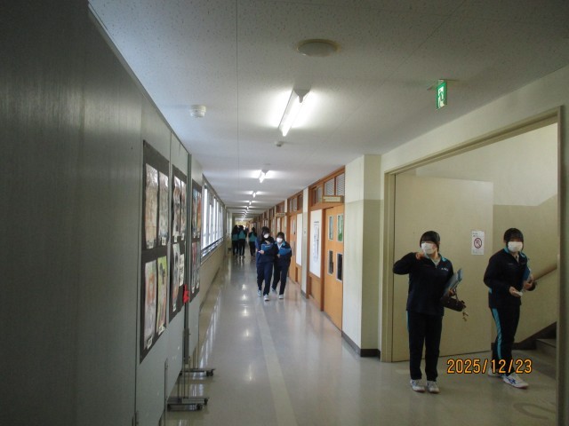 本日23日は冬至の翌日です。これからは一日ごとに昼の時間が長くなっていきます。冬晴れの日本庭園では、すっかり葉を散らした樹木が目立っており、その影が長く伸びていますが、これから太陽が少しずつ高くなっていくにつれて影は短くなっていきます。このような自然の動きからも、生徒は季節の移り変わりを感じることができることと思います。12月23日は、平成の時は天皇誕生日になっており、24日のクリスマスイブの1日前の休日でしたが、令和では平日となっています。2学期の授業も本日と明日の2日を残すだけとなり、25日は終業式です。もうすぐ2週間の冬休みですが、9年生は高校受験が近づき、落ち着かない日が続くことになると思います。加賀中学校の生徒は、本日も頑張っています。3校時と4校時の間の各階の様子を見てみましたが、どの学年の生徒も元気に行動していました。また、教室移動の生徒が大変明るく話しかけてくるなど、仲良く元気にあふれている姿に、学校生活の楽しさが伝わってきました。生徒には、これからも体調管理に気を付けて、「毎日一歩前進」で頑張ってほしいと思います。