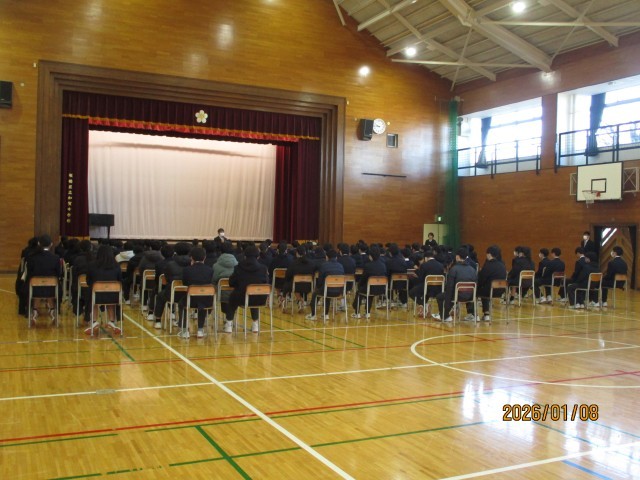 本日8日から3学期が始まります。本日の始業式はオンラインにより実施され、生徒は教室での出席となりました。最初に校長から、新年の挨拶に続いて、3学期の心構えについて、良い結果を得るためにはいかに「準備」が大切であるか話がありました。続いて、8年生の生徒代表の2名から、各学年それぞれに、3学期をどのように過ごしていくべきかの話がありました。引き続いて、全校集会となり、生活主導主任から、3学期の過ごし方について、諸注意とともに、9年生には高校受験に向けた留意点の、7・8年生には落ち着いた学校生活環境が9年生の後押しになるとの呼びかけがありました。なお、本日はオンラインでの実施のため、いつも行われる校歌斉唱と生徒表彰については、後日改めて、全校生徒が集合した機会に実施することが伝えられました。始業式・全校集会に続いて、各教室で学活が行われるとともに、順次体育館で学年集会が実施されました。子供たちは、各場面でそれぞれの大事な話を真剣に聞いていました。本日は、3学期のスタートであるとともに、新しい1年のスタートでもあります。4月からは、7年生は、8年生として学校の中核を担うことになり、8年生は、9年生として学校をまとめていく立場になると同時に高校受験に直面することになり、9年生は、高校生として新たな学校生活が始まります。子供たちには、このような先も見据えて、「毎日必ず一歩前進」で3学期も有意義な学校生活を過ごしてもらいたいと思います。