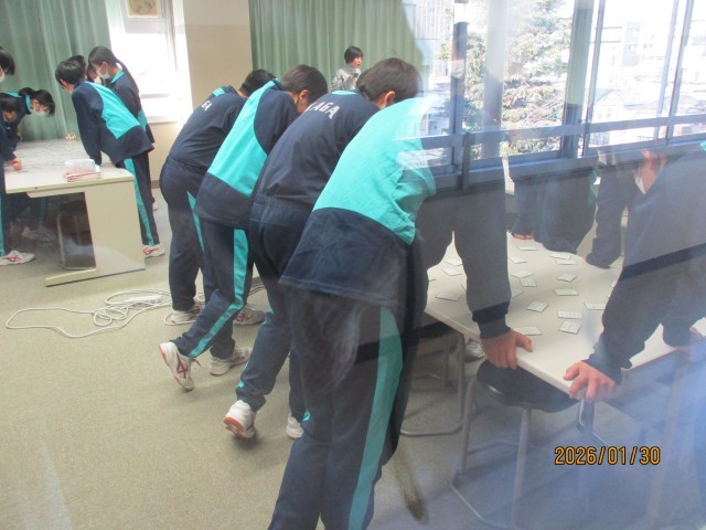 1月も本日が30日となり、明後日の日曜日からは2月になります。9年生は、都内の高校の一般受験を迎えるため、最後の追い込みにさらに熱が入るものと思います。本日も西高東低の冬型の気圧配置のため、東京は好天に恵まれたものの寒い日となりました。来週には、節分と立春を迎えますが、これからは暖かくなりつつも寒さの戻りもある「三寒四温」で本格的な春になっていくようです。今年は、桜が咲くのが早いのではないかともいわれています。本日、パソコン室で7年生が国語の授業で百人一首を行いました。子供たちは3班に分かれ、それぞれ取り札のある机の周りに集まって、教員の読む和歌に耳を傾け、札を取って盛り上がっていました。百人一首は、天智天皇から順徳院まで約600年間の和歌が選ばれており、和歌に託した昔の日本人の気持ちを知ることができます。最近では外国語にも訳されるなど、広く親しまれています。家庭では、お正月の風物詩としてもなじみが深いのではないかと思います。また、楽しみながら和歌を覚えることでき、古文の文法にも親しむことができます。子供たちは、今は「かるた」として楽しむことが中心だと思いますが、これから先に百人一首で学んだことが、授業などで役に立っていることに気が付いていくのではないかと思います。