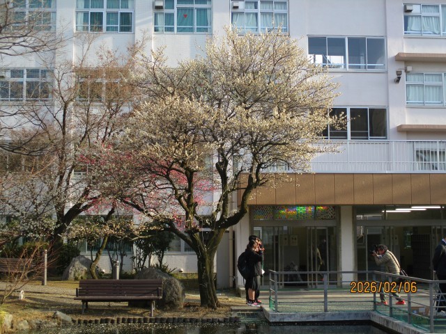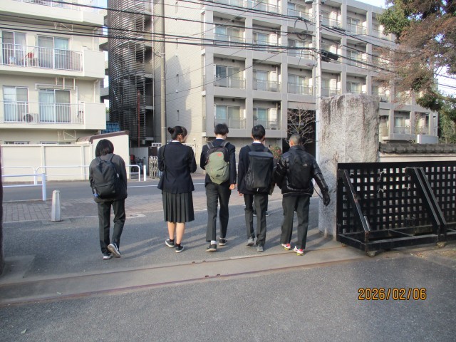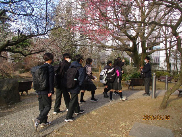 本日6日は、8年生の校外学習を実施しました。天気にも恵まれ、気温も3月下旬並みに上がるとのことで、教員一同安心したところです。8時30分前には班ごとに正門周辺に集合し、揃った班から順に並んで、受付で教員のチェックを受けました。受付で連絡用のスマートフォンとデジタルカメラを受け取り、準備完了です。受付後には、白梅の木の下で、業者の方から班ごとに記念写真を撮っていただきましたが、みんな楽しそうでした。写真撮影後、子供たちは、日本庭園の道を通って、正門から自分たちで計画したコースに向けて元気に出発していきました。校外学習は、今まで経験してきた移動教室や職場体験と違い、各チェックポイントに教員がいるものの、同行者に教員や大人がいません。各班で子供たちが協力しながら、ルールを守って計画通りに行動し、学習の成果を上げることが求められます。交通機関のトラブルなど予期せぬアクシデントが起こる恐れもあります。その場合、必要なときは教員に連絡することになりますが、まずは班の全員が力を合わせて対処していくことになります。また、校外学習は、9年生になった時の修学旅行に向けての事前学習の位置付けがあります。班ごとに学習テーマを設定して見学コースを作成し、交通手段・移動経路・時間配分といった計画を立て、それぞれの子供が役割をもって行動することになりますが、その態度を身に付けていく大切な経験になります。今年の校外学習のスローガンは「小さな一歩、大きな未来」です。本日の校外学習で、子供たちがどのように学び、成長していくのか楽しみです。