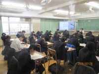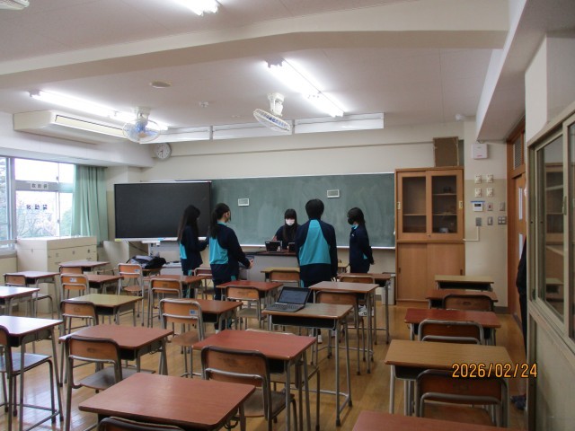 本日24日は、生徒会朝礼が実施されました。インフルエンザの感染防止のため、オンラインでの朝礼となり、生徒会本部役員が3階の少人数教室に集まりました。本日の案件は、「ルールメイキング」の報告ということで、ルール改定アンケートの結果を踏まえたアウターとカーディガンに関する新たなルールの試行についてでした。生徒会本部役員がパワーポイントを使いながら交代で分かりやすく説明し、各教室では子供たちがモニターを注視し、真剣に説明を聞いていました。最後に、新たなルールに加え今までのルールもきちんと守ろうと呼びかけがあり、加賀中学校のルールに対する意識の高さを感じました。