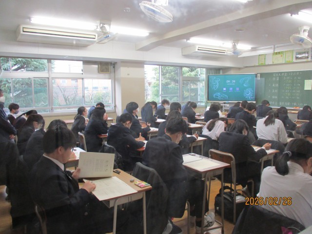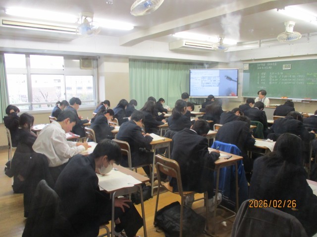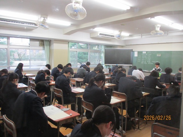 本日26日は、学年末考査の2日目でした。本日も子供たちは、登校後、8時25分から8時50分までの「学習」の時間で最後のまとめをして、試験に臨みました。本日の試験は、各学年共通で、1校時が「英語」、2校時が「美術」、3校時が「保健体育」でした。各学年とも、子供たちは今までの学習の成果を発揮するべく、試験問題に一生懸命に取り組んでいました。写真は各学年の試験中の様子ですが、子供たちの頑張りが伝わってくることと思います。昨日から始まった学年末考査も、残すところ明日1日のみとなりました。本日も曇りがちの天気となり、風もあって寒さを感じる日となりましたが、午後からは気温が上がり、明日からはまた暖かくなるようです。気温の変化が大きくなっており、インフルエンザも流行っています。子供たちにはくれぐれも体調管理に気を付け、学年末考査を無事に乗り切り、納得のいく結果を修めてほしいと思います。