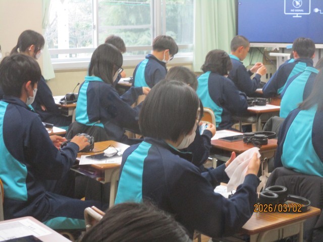 また、本日は、7年生と8年生が「英語スピーキングテスト」を受けました。このテストは、東京都教育委員会が都内の公立中学校等を対象に実施するものです。9年生が受けるものは、評価結果が都立高校の入試にも直結する位置付けになっており、都立高校などを会場として実施されることで広く知られています。一方、7・8年生のスピーキングテストは、各中学校等で実施されますが、それぞれの学年に応じて目標とするレベルが設定され、その目標とするレベルに到達しているかどうかを3段階で総合評価する点は同じです。加賀中学校でも、専門の業者の方がいらっしゃって打合せをした後、各クラスごとに実施されました。子供たちは説明を真剣に聞き、テストに取り組んでいました。特に、7年生は初めてのスピーキングテストということで、少し緊張しているように感じられました。個別の結果は5月以降に返却される予定です。全体の実施状況も、東京都教育委員会から5月以降に公表される予定です。
