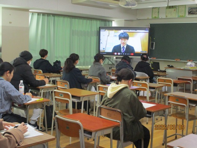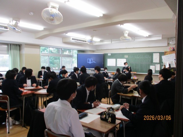 また、卒業式を2週間後に控え、昨日から9年生は特別時間割となっています。今年も昨日から、校長が各クラスに1時間ずつ特別授業を実施しております。今年は、歌詞を4編選んで、その世界を読み取り、自分の考えを伝えることとほかの人の考えから学ぶことができることをめあてとしていました。「校長先生の授業」ということで、生徒には緊張もうかがえましたが、しっかりと話を聞き、グループで話し合っていました。高校進学に向けて、思い出に残る授業になったのではないかと思います。