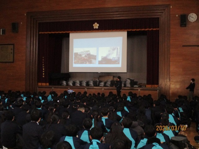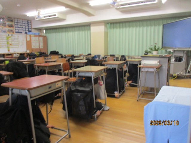 本日10日は、朝方のみぞれが午前中には雪に変わる寒い日となりました。雪はお昼近くに止み、午後には日も差してきましたが、寒さは続きました。本日は3月の避難訓練を実施しました。明日の11日が、東日本大震災から15年目にあたっていることから、今回の訓練は地震発生時の訓練とし、体育館に避難集合した後、担当教員からの講話では、「3.11を忘れない」のテーマでスライドを使いながら東日本大震災を改めて振り返り、教訓とすることとしました。15時30分に地震発生の緊急放送があり、身の安全の確保が指示され、揺れが収まった後、体育館への避難指示が伝えられました。子供たちは教員の指示に従い、机の下に身を隠して安全を確保した後、整然と体育館に避難しました。人員点呼により全員の無事が確認され、全体反省と講和となりました。全体反省では、校長から、15年前の東日本大震災では東京でも震度5強の揺れとなり、その中でどのような様子であったかという実体験の話があり、子供たちは興味深く聞いていました。続いての講和では、スライドによる東日本大震災当時の東北の被害の状況や2年前の能登半島地震の話により、子供たちは地震の怖さを再認識したように思われました。同時に、地震に備えるためには何が大切かを再確認する機会になったように思われました。本日の避難訓練は、明日の3.11に向けて、子供たちにとって「地震に備えることの大切さ」を学ぶ有意義な訓練になったのではないかと思います。