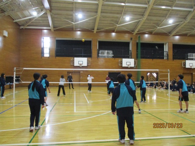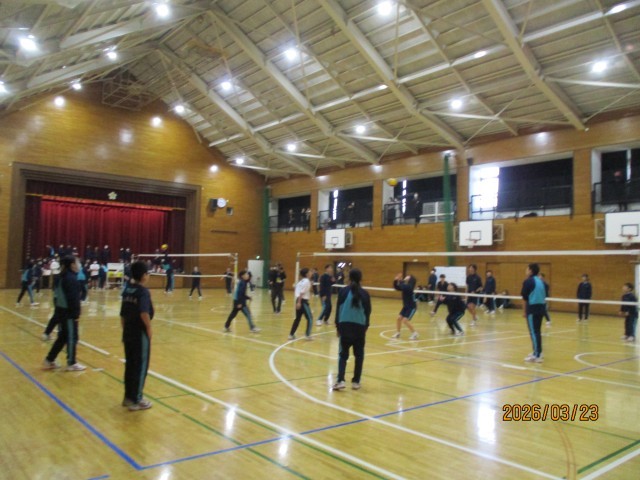 本日23日は、7年生のスポーツ大会が実施されました。朝方は雨模様だったため、残念ながら、当初予定していた全員参加による各組対抗のリレーは中止となってしまいましたが、その分、体育館でのバレーボール、バスケットボール、ドッジボールでは、勝利を目指してより熱い戦いが繰り広げられました。さらに最後には、教員チームと子供たちの代表チームによるバレーボールの試合も行われました。教員も懸命にボールを拾うなど試合は一進一退となり、子供たちは大いに盛り上がっていました。熱戦の中にも、子供たちと教員との温かいつながりを感じる試合だったと思います。本日も保護者の皆様にも観覧していただきましたが、みんなで力を合わせて頑張る子供たちの姿を間近にご覧になり、加賀中学校での1年間の成長を実感していらっしゃるようでした。