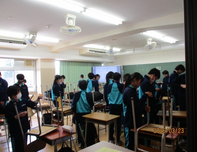 また、本日の5校時には、7・8年生による大掃除が行われました。明後日が修了式になりますが、1年間お世話になった教室や特別教室などをきれいに清掃するものです。子供たちは、改めて教室や特別教室に感謝しながら一所懸命に掃除をしていました。その姿からは、自分たちはもちろん、入学してくる新7年生もきれいな加賀中学校で気持ちよく新年度を迎えられるようにしようという心が伝わってくるようでした。最後に、清掃用具を点検し、用具をきちんとそろえて新年度の準備が整いました。