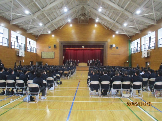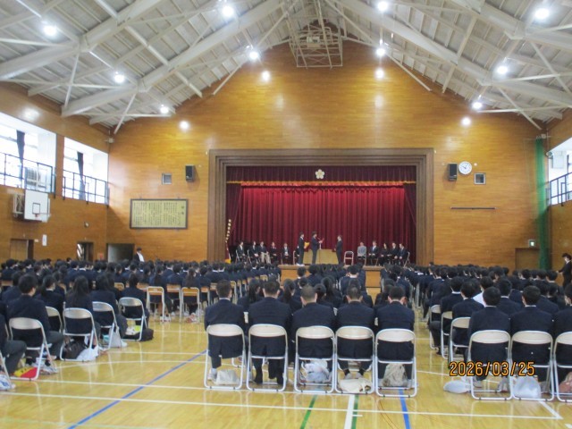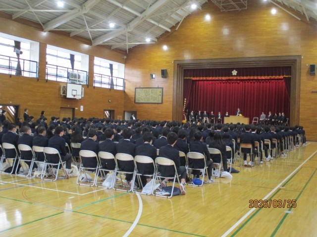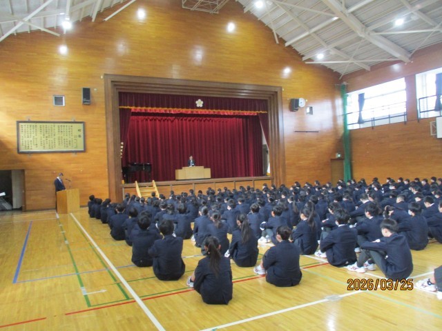 本日25日は、令和7年度の修了式と今年度で加賀中学校を去られる教職員の離任式を実施しました。修了式では、最初に校長から、7年生代表と8年生代表にそれぞれ学年の修了証が授与されました。続いて校長から、異動のため最後の話になるということで、7年生と8年生に向けて思いのこもった話がありました。「成長するのは無限大」であるが、そのためには学ぶべき時に学ぶことが大事であり、これからも加賀中生には「毎日必ず一歩前進」に向けて努力を続けてほしいとの願いを、子供たちは改めて強く心に刻んだように思われました。続いての8年生の生徒代表の言葉も、今の校長の話を受け止めつつ、それぞれ1学年進級する全生徒に向けて、「あなたは今日どのような一歩を踏み出すか。」と力強く呼びかけて、締めくくられました。その後、生徒代表の指揮・伴奏により校歌を斉唱して修了式は閉式となりました。