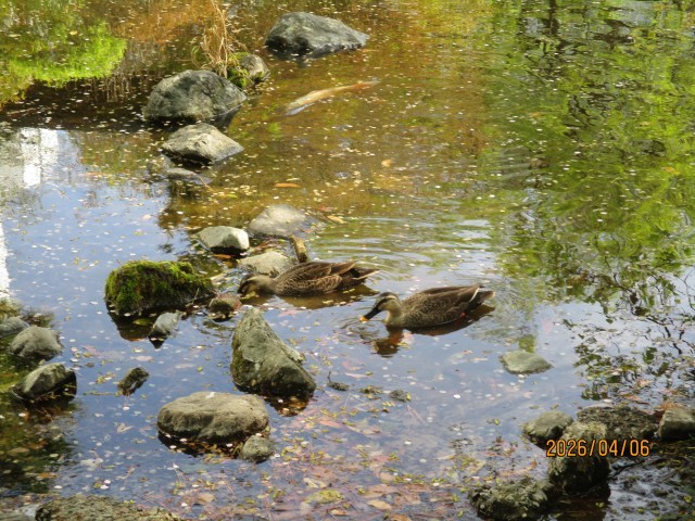 また、本日もつがいのカモが、桜の花びらが浮く日本庭園の池を泳いでいるところを確認できました。仲良く水の中にくちばしを入れて、一生懸命に餌を探している様子でした。日本庭園が気に入ってくれて、無事にひなが産まれてくれることを加賀中学校全体が願っています。子供たちも生き物をいつくしむ気持ちで、温かく見守ってくれることと思います。
