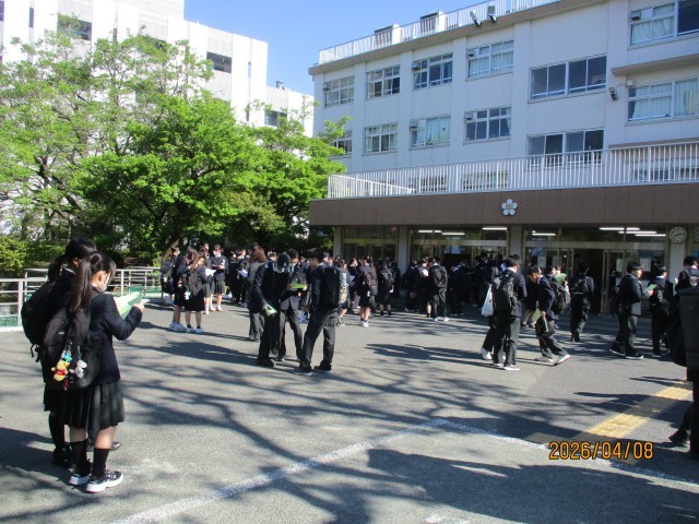 本日8日は、令和8年度の1学期のスタートの日です。本日は、朝から雲一つない晴天で新年度に向けての元気をくれるような青空が広がっていました。8時10分から「クラス発表」ということでしたので、多くの子供たちが8時過ぎから生徒玄関前に集まって時間が来るのを待っていました。子供たちは、担当の教員からクラス分けのプリントをもらうと、友達同士でクラスを確認し合いながら新しい教室に向かっていました。教室に荷物を置くとすぐに、着任式と始業式が行われる体育館に集合し、新しいクラス順に整列しました。着任式では、壇上にこの4月から加賀中学校に着任された校長はじめ教職員が並び、副校長から一人ずつ紹介されました。続いて、校長から順に自己紹介の挨拶がありましたが、子供たちは礼儀正しい挨拶で応えるとともに、大きな拍手で歓迎していました。引き続いて1学期の始業式が行われました。校長からの話に続いて、生徒代表から、新8年生、新9年生に向けて、さらに成長できる有意義な1年にしていこうと呼びかけがありました。最後に生徒代表の指揮・伴奏により元気に校歌を斉唱し、始業式は終了しました。続いて全校集会が行われ、校長から担任、副担任、学年主任、各主任等が改めて紹介されましたが、子供たちの嬉しそうな様子が印象的でした