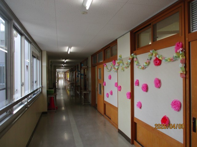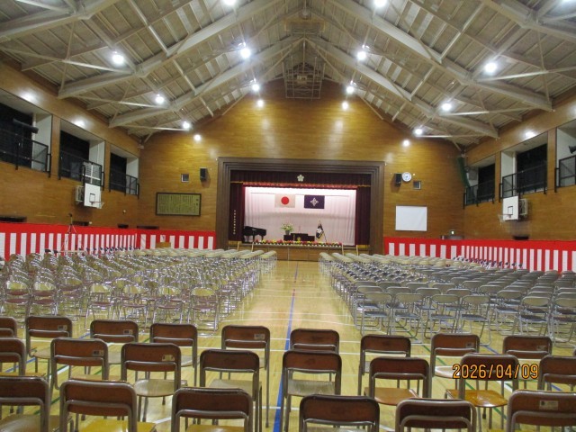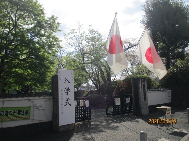本日9日は、加賀中学校の入学式を実施しました。本日の天気は、雲はあるものの日差しに恵まれ、太陽も新入生の入学を祝ってくれているようでした。入学式の式場は体育館でしたが、昨日の始業式後に9年生が準備を整えてくれました。また、新入生のフロアとなる校舎の4階では、やはり昨日に8年生が歓迎の飾りつけをしてくれました。9時から新入生の受付が始まりましたが、保護者の皆様と一緒の少し緊張した様子の初登校でした。受付でクラスを確認すると、9年生の誘導でそれぞれの教室に移動し、学活を行い入学式を待ちました。時間になり、クラスのプラカードを持った9年生を先頭に1組から順に式場に入場すると、来賓や保護者の皆様、9年生、8年生の兄姉から、祝福の大きな拍手で温かく迎えられました。国歌斉唱に続いて、新入生が一人ずつ名前を呼ばれると、元気に返事をして起立しました。校長の式辞、来賓代表のPTA会長の祝辞、来賓の皆様の紹介と進み、生徒代表の9年生から、加賀中学校の生活を紹介しながらの心温まる歓迎の言葉がありました。それを受ける形で、新入生代表から、中学生になった自覚と希望にあふれる力強い、大変立派な誓いの言葉が続きました。最後に、生徒代表の指揮・伴奏により校歌を斉唱して、滞りなく入学式は終了となりましたが、続いて校長から教職員の紹介があり、その後に新入生は大きな拍手の中退場しました。引き続いて、体育館で記念写真撮影もありました。朝早くから緊張が続いたのではないかと思いますが、新入生にとっては、改めて加賀中学校の生徒になったことを自覚できる入学式だったと思います。また、保護者の皆様におかれましては、子供たちの成長を実感された嬉しい入学式になったことと思います。