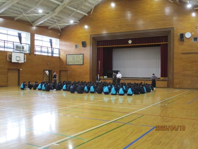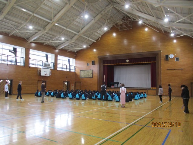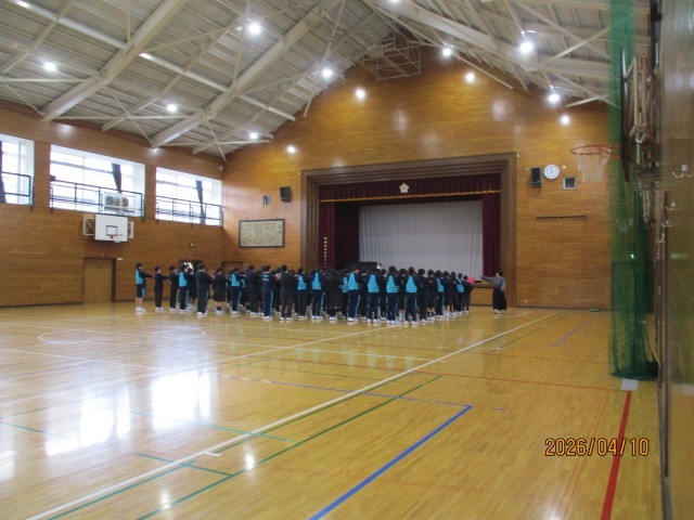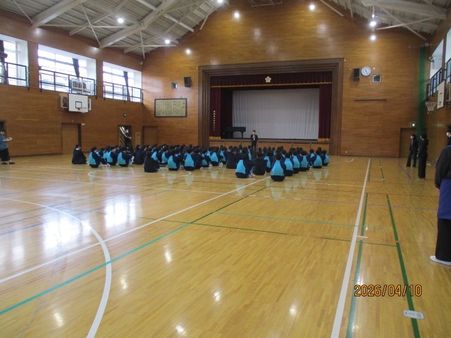 本日10日は、印象深かった入学式も終わり、特別時間割で4時間授業を行いました。また、本日から給食も始まりました。各学年では、2校時に8年、3校時に9年、4校時に7年が、新年度初めての「学年集会」を体育館で実施しました。学年集会では、まず、新しいクラスの整列順を決定し、朝礼や学年集会の並び方を確認しました。きちんと整列した後、教員が改めて自己紹介をしました。続いて、年度の初めということで、生活の話や服装チェックを行い、さらに学年目標について子供たちに伝達しました。さすがに8年生、9年生は上級生らしくスムーズな進行でした。7年生は初めてということもあり、きちんと確認しながらの進行でしたが、教員からの指示をしっかりと受け止めていました。年度初めということで、来週の15日の水曜日までは特別時間割となりますが、16日の木曜日からは通常の時間割が始まります。今年度も子供たちには、健康に留意して、「毎日一歩前進」する有意義な加賀中学校生活を過ごしてもらいたいと思います。