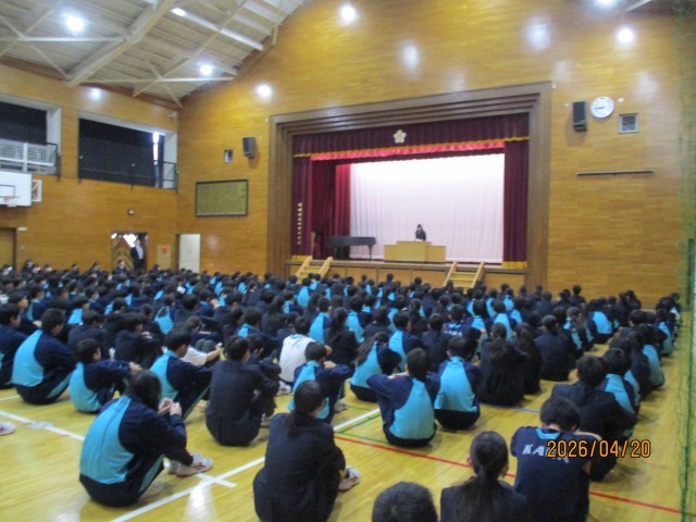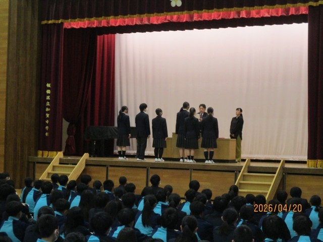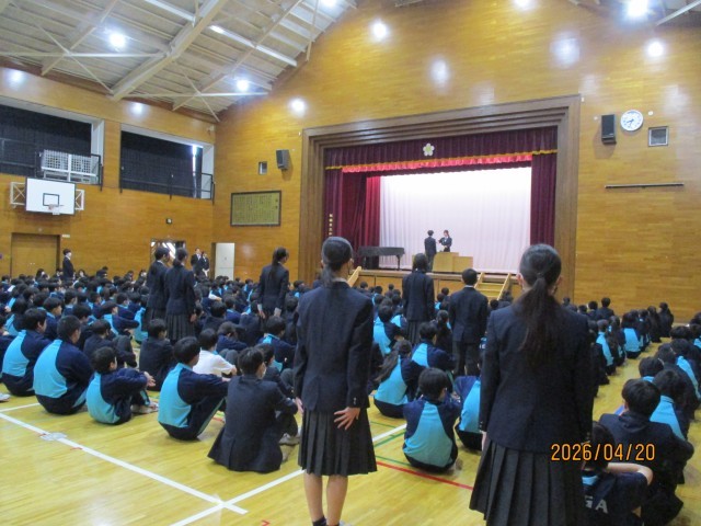 本日20日は、令和8年度前期の認証式を実施しました。8時25分に全生徒が体育館に集合・整列し、生徒会役員の司会で認証式は始まりました。最初に、生徒会本部役員6人が登壇し、一人ずつ校長から委嘱を受けました。また、欠席した1名の紹介もありました。続いて、生徒会長から各委員会の委員の認証が行われました。最初は、各学年の学級委員会委員の認証でした。学級委員は、学年ごとに、生徒会役員から名前を呼ばれると元気よく返事をして舞台前に整列し、各学年の学級委員長が代表して壇上で生徒会長から認証書を受け取りました。続いて、生活委員会から順に各委員会委員の認証が行われました。各委員は、生徒会役員から名前を呼ばれると元気よく返事をしてその場で起立し、委員長が代表して壇上で生徒会長から認証書を受け取りました。認証を受ける生徒は、やや緊張した様子がうかがえましたが、全校生徒が集まる厳粛な雰囲気の中で認証されたことにより、各クラスを代表する委員会の委員として頑張っていこうという意識が高まったように思いました。