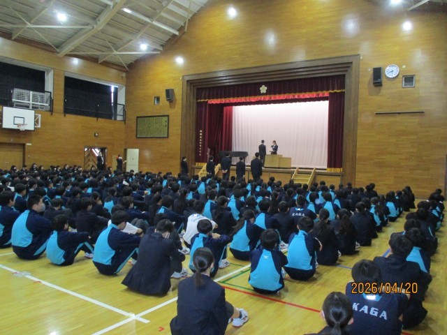 続いて生徒会朝礼が行われましたが、認証されたばかりの委員長たちが、年度当初にあたって全生徒に伝えたい事項を伝達しました。どの委員長の言葉も、内容が整理されていて聞き取りやすく、理解しやすいものでした。しっかりと準備をしてきたことが分かり、落ち着きもあり、大変頼もしく感じました。生徒会本部やそれぞれの委員会の活動により、加賀中学校がさらに素晴らしい学校になっていくことを大いに期待したいと思います。
