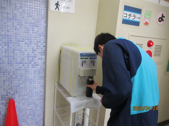 本日24日、一昨日に校舎の2階、3階、4階に設置されたウオーターサーバーの使用を開始しました。ウオーターサーバーの給水口は「冷水」と「常温水」に分かれ、それぞれの給水口のレバーを水筒で押せば、冷水又は常温水が水筒に注がれるようになっています。子供たちもさっそく使っていました。ただ、本日は、さほど気温が高くなっていないため、利用が増えてくるのはこれからと思われます。来週は夏日近くまで気温が上がるとのことですので、子供たちもウオーターサーバーの効果を実感してくるのではないかと思います。来週末には5月になりますが、今年の夏は早くやってきて、長くなりそうとのことです。暑さ対策として、子供たちには、学校で冷水を飲むことができるウオーターサーバーを積極的に利用してもらい、健康管理に留意してほしいと思います。
