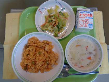 チキンライス クリームスープ ごまドレッシングサラダ 牛乳