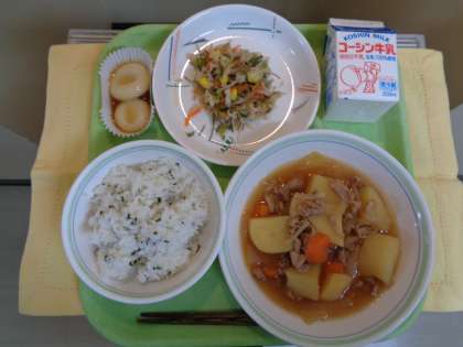 わかめご飯 肉じゃが 牛乳 切り干し大根のサラダ みたらし団子