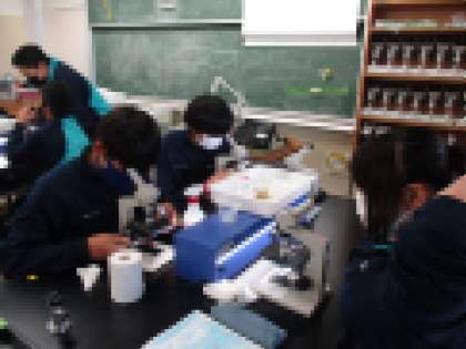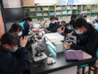 7年生の理科の授業では、加賀中学校の池の水を採取した池の水を、スポイトを使いスライドガラスにのせて顕微鏡で観察しました。一人1台の顕微鏡があるので全員がしっかり観察でき生き物を発見することができたようです。
