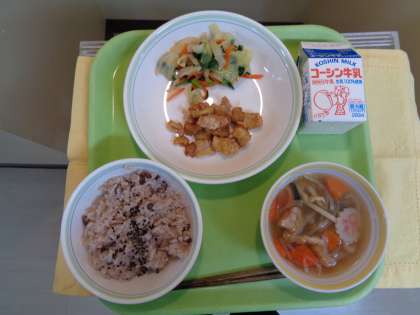 赤飯 鶏肉のカリン揚げ おひたし 吉野汁 牛乳