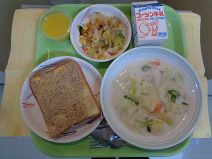 セサミトースト 春野菜のクリームシチュー ボイル野菜のドレッシング オレンジゼリー 牛乳
