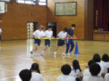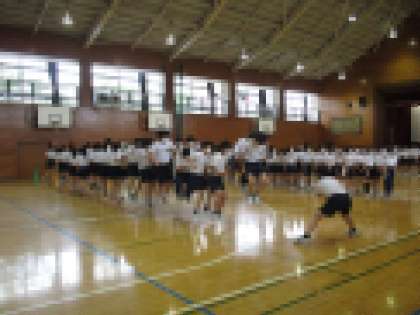 あいにくの雨のため体育館で行われました。練習内容の説明とラジオ体操の後、学年種目、全員リレー、綱引きの説明とルール確認がありました。その後、クラスごとに大縄跳びの練習を15分間行い、2分×2回のプレマッチを行いました。練習では全く跳べなかった状態から1〜2回、5回跳ぶことができ、歓声があがりました。体育委員を中心に練習を進める9年生の姿に最高学年としての自覚が見られ、たいへん素晴らしかったです。