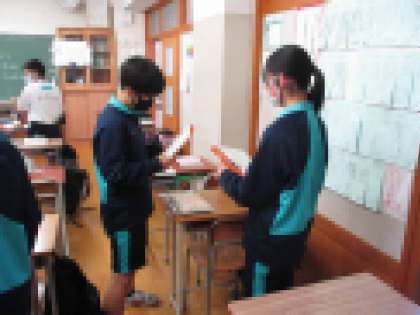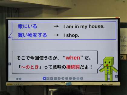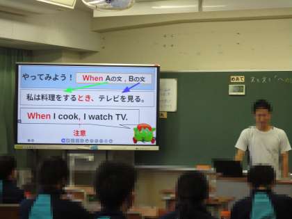 2クラスを3グループに分けて3人の英語科教員が指導する少人数指導で授業を行っています。帯活動として1分間の速読・多読に取り組み、1Minute Talkingを行い、What do you call this?という質問を交えて生徒間でコミュニケーション活動をしました。本日は接続詞whenを使って文と文をつなぎ、「〜のとき・・・」という表現方法を学習しました。表現力を高めるために大切な表現方法です。しっかりと理解し、表現力を高めましょう。