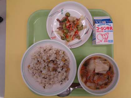高菜とじゃこのチャーハン 牛乳 ワンタンスープ 焼肉サラダ