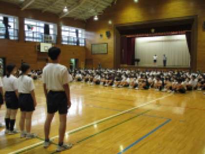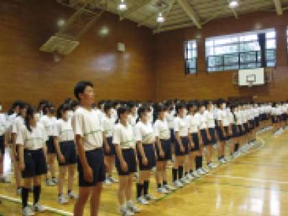体育館の広さには限りがあるので、ラジオ体操と校歌の練習は学年毎に発表し、他の学年は座って発表をみる形式をとりました。練習最後に9年生の校歌がありましたが、あらためて最上級生だと実感することができたきれいな歌声でした。本番楽しみです。