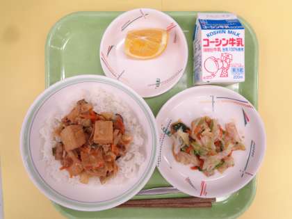 家常豆腐丼(ジャーツァンドウフどん) ナムル 果物(夏みかん) 牛乳