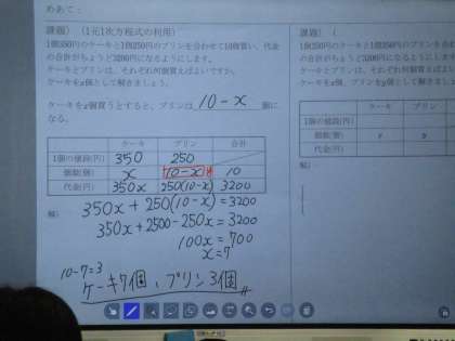 今日の8年生数学の授業では、連立方程式を利用した解き方を学習しました。始めに今日の課題を全体で解き、次にペア学習を行い、解き方を説明し合いOUTPUTを行います。その後例題1を全体で解き、最後はグループワークで問題1に取り組みました。グループワークでは、一人一人解き方を理解しているため集中して取り組む様子が見られました。今日学習した連立方程式は、9年生の2次方程式へつながる大切な単元ですので、皆さん頑張りましょう。