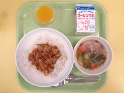ホイコーロー丼 牛乳 春雨スープ オレンジゼリー