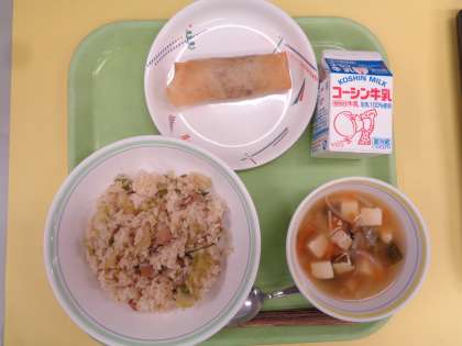 レタスと焼き豚の炒飯 中華スープ 春巻き 牛乳