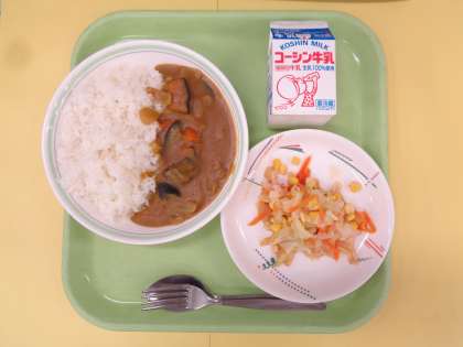 夏野菜カレーライス キャベツとコーンのサラダ 牛乳