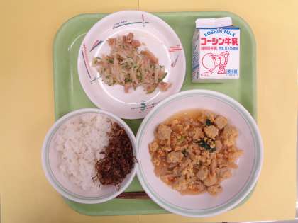 麦ご飯 骨太エコふりかけ 高野豆腐の卵とじ ツナ大根 牛乳