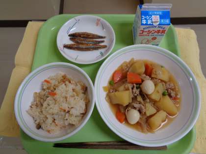 【献立】五目ご飯 肉じゃが きびなごの唐揚げ 牛乳