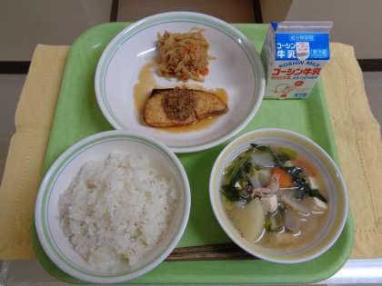 【献立】麦ご飯 カンパチのピリ辛焼き 豚汁 切り干し大根の煮付け 牛乳