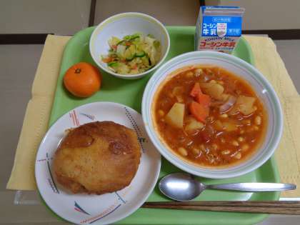 【献立】ビスキュイパン 鶏と大豆のトマト煮 野菜サラダ みかん 牛乳