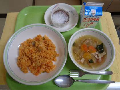 【献立】チキンライス レンズ豆のスープ チョコケーキ 牛乳