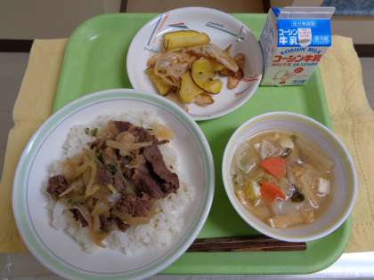 【献立】国産和牛肉の牛丼 野菜チップス 具だくさんみそ汁 牛乳