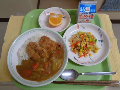 【献立】合格カツカレー コーンサラダ いよかん 牛乳