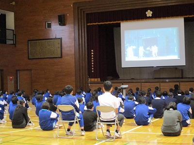 1時間目に学年集会を体育館で行い、原爆投下直後の様子などについてのお話をききました。