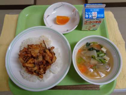 【献立】かき揚げ丼 道産子汁 せとか 牛乳