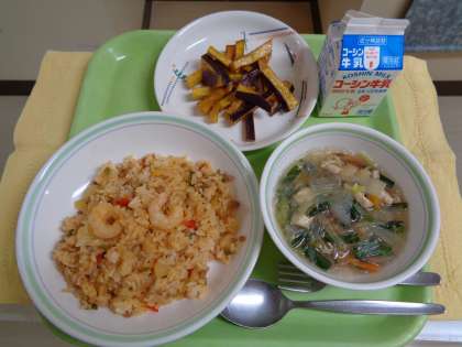 【献立】ナシゴレン(インドネシア風炒飯) ソトアヤム(鶏肉と春雨のスープ) ウビゴレン(揚げさつまいも)牛乳