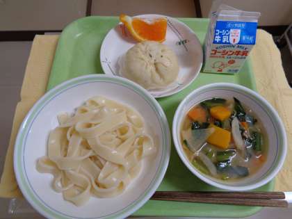 【献立】ほうとううどん 手作り肉まん でこぽん 牛乳
