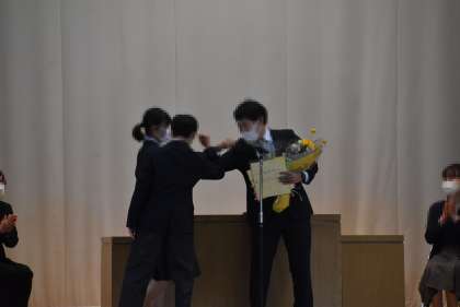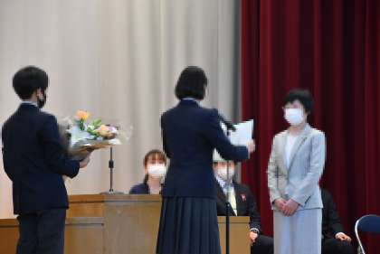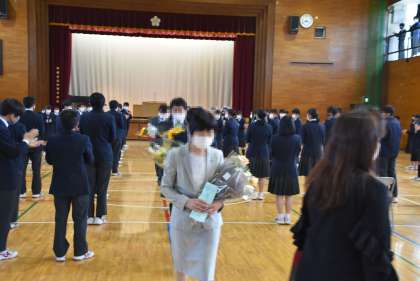離任式では、生徒から感謝の言葉と花束を贈呈され、離任者からは生徒への熱い思いを感じるお話しがありました。